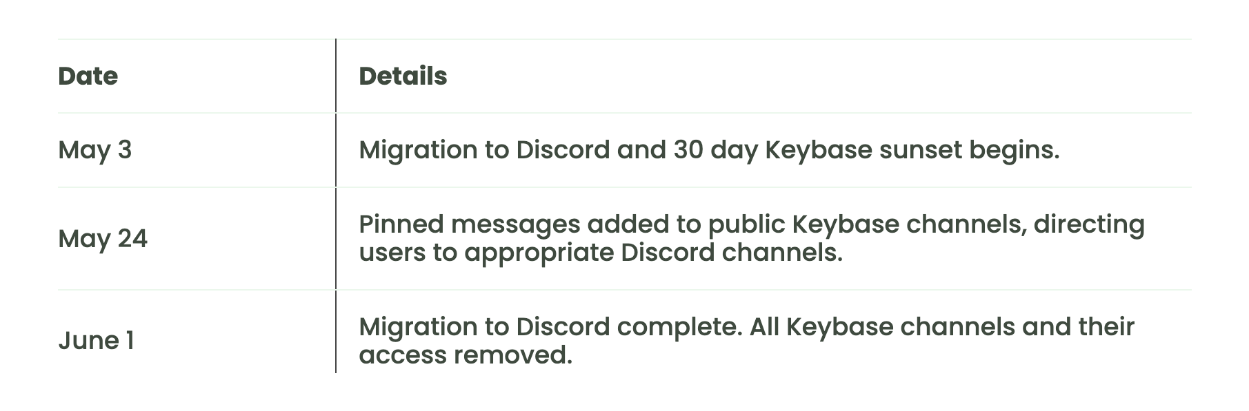 - Beginning May 3, we will start sunsetting most public community Keybase channels and initiate the transition to Discord for all support and developer relations communications. On June 1, all Keybase channels, besides General, will have access removed, with all interactions officially transitioning to Discord. General will remain for archival purposes and to help direct folks to Discord.