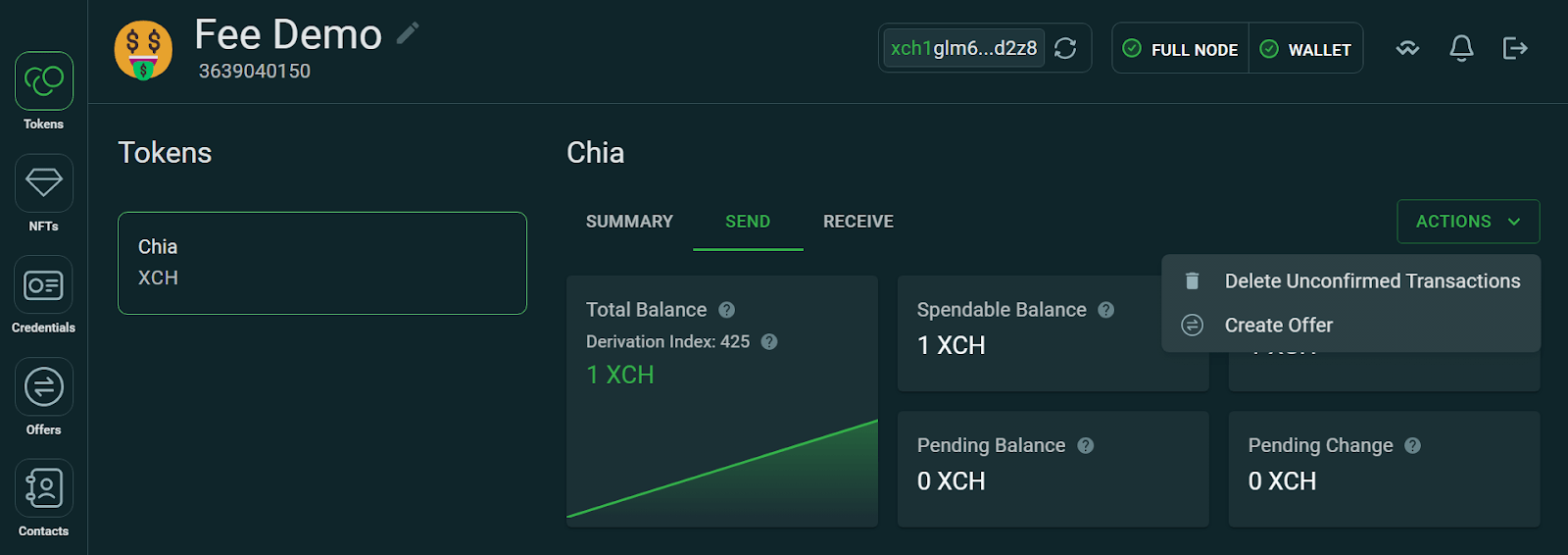 *Note that as of version 2.1.4, there is a bug in the fee estimator. While it typically provides an accurate fee (as in the image above), it occasionally provides an underestimate. If you want to be more certain that your transaction will be processed quickly, you may want to enter a custom fee of 100 million mojos (0.4 US cents as of this writing) for standard XCH spends, or 1 billion mojos for more complex spends, such as those involving Offers, CATs, or NFTs. For the exact fee recommendations for various types of transactions, see our documentation.